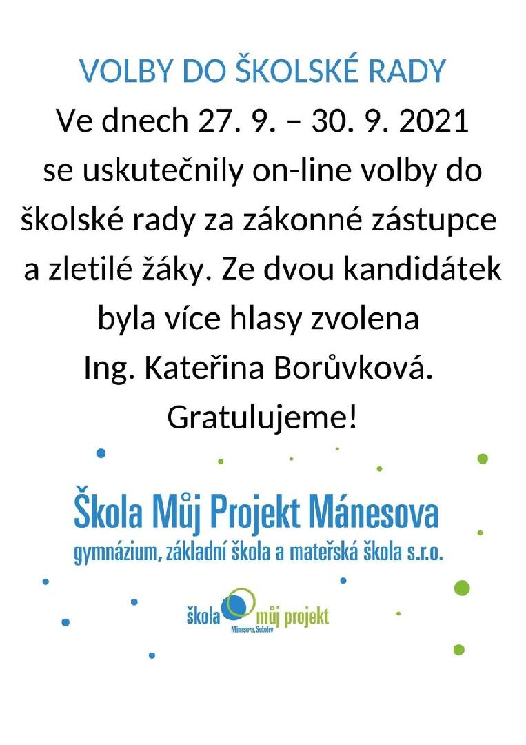 V on-line volbách do školské rady za zákonné zástupce a zletilé žáky zvítězila Ing. Kateřina Borůvková. Zvolené kandidátce srdečně gratulujeme a těšíme se na spolupráci na rozvoji naší školy.