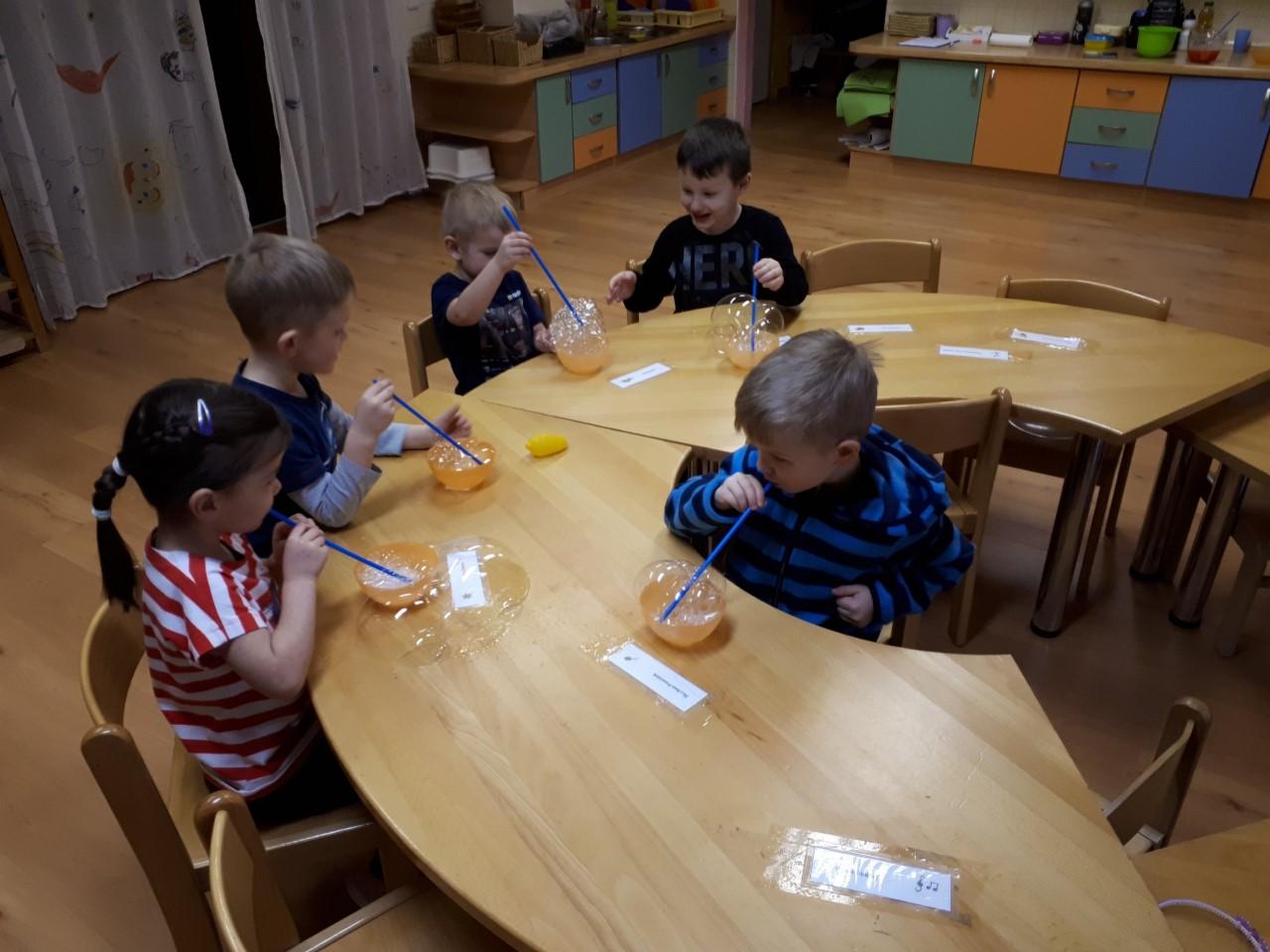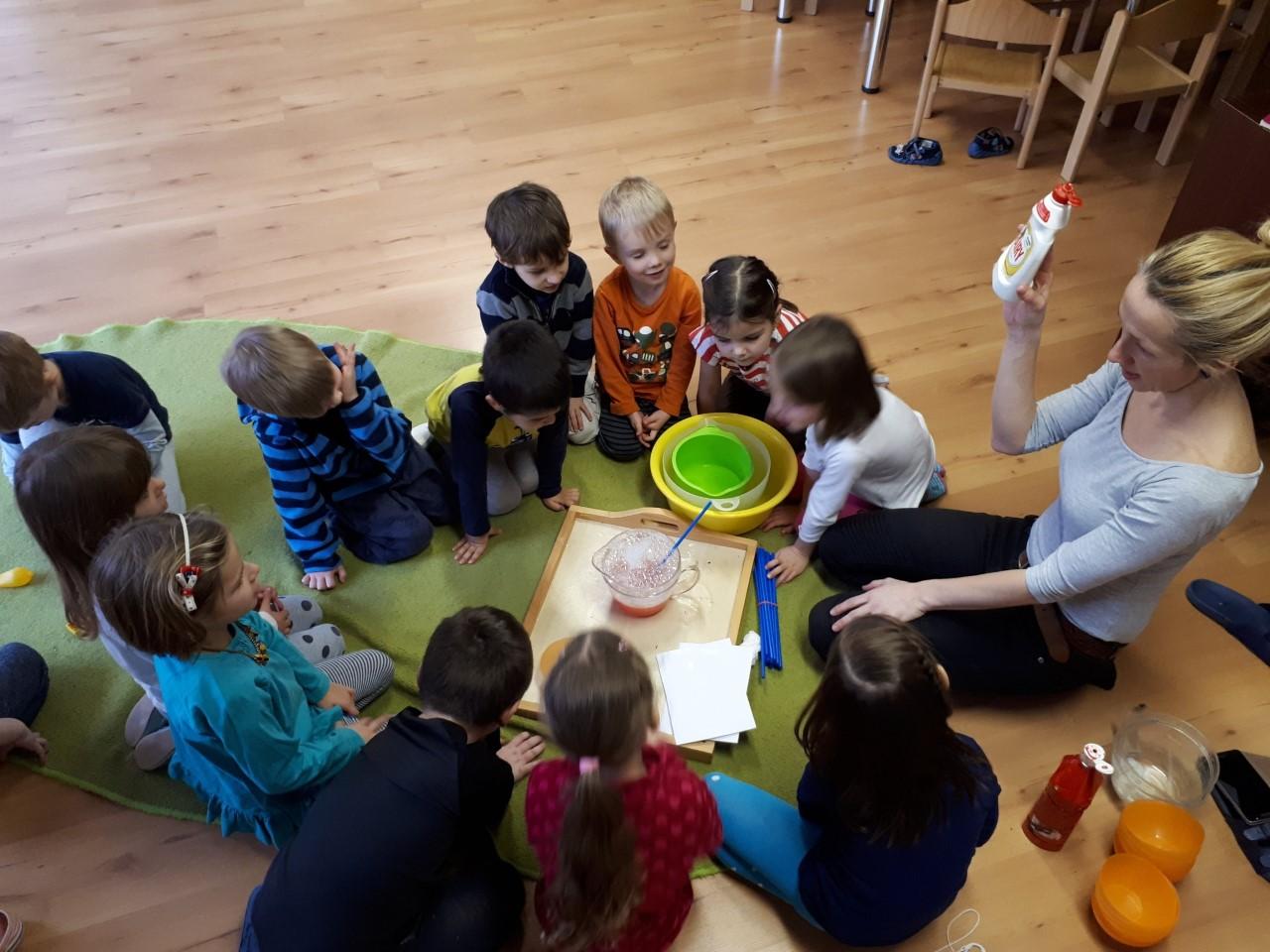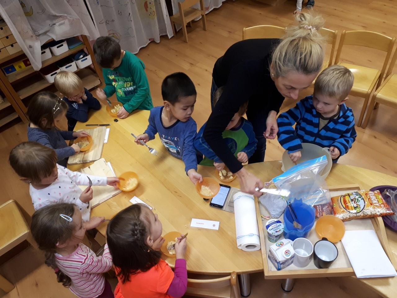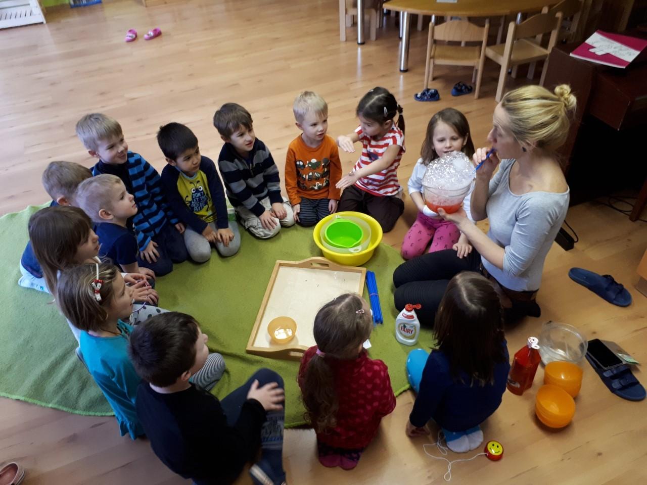 V mateřské škole je pravidelná část dne vedena v anglickém jazyce a snažíme se, aby k němu měly děti pozitivní vztah. Ne nadarmo se říká, že do 6 let nasáváme informace jako houby. Nenásilnou formou je proto seznamujeme s novými slovíčky, slovními obraty, písničkami a říkankami, dramatizací pohádek a řešením každodenních situací. Učitel na děti hovoří zásadně anglickým jazykem a mateřský jazyk je použit výjimečně.