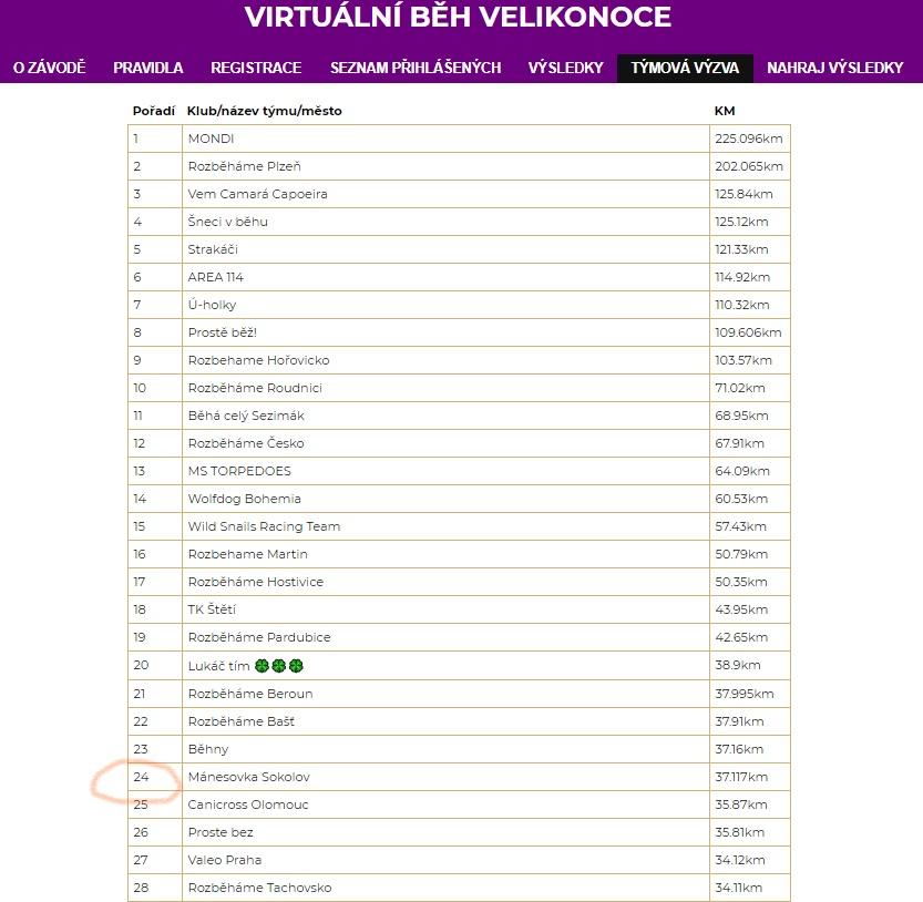 134 775 Kč vynesl virtuální běh Velikonoce pořádaný v rámci projektu Rozběháme Česko. Tým Mánesovka Sokolov si mezi 572 účastníky doběhl pro senzační 24. místo. Společně jsme všichni přispěli platformě Senzační Senioři: SenSen, která vznikla díky Nadaci Charty 77 a propojuje tisíce vitálních a aktivních seniorů.